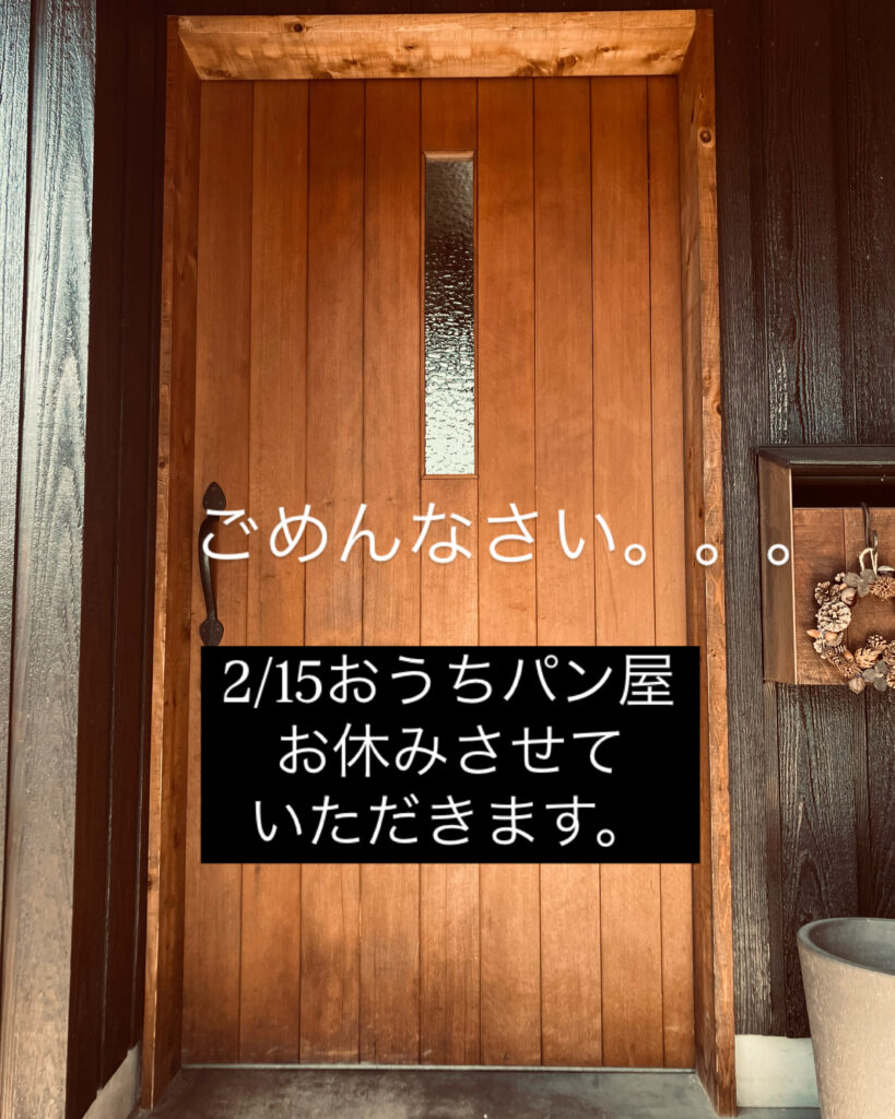 2/15お休みします!2025年2月14日おうちパン屋, 未分類 直前に申し訳ございません。 2/15(土)に予定していたおうちパン屋ですが、 家族の体調不良のため お休みさせていただくことになりました。 次回は、2月末を予定しています。 またお知らせいたしますので、 どうぞよろしくお願いいたします。 おうちパン屋, 未分類